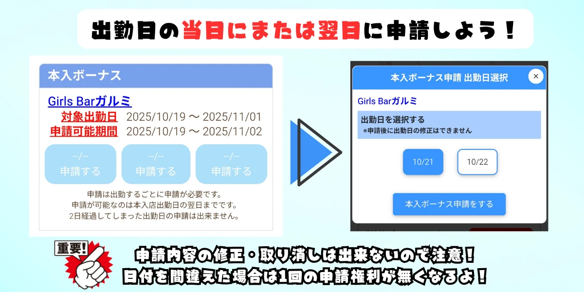 ・本入ボーナスの申請は1出勤ごとに必要です。