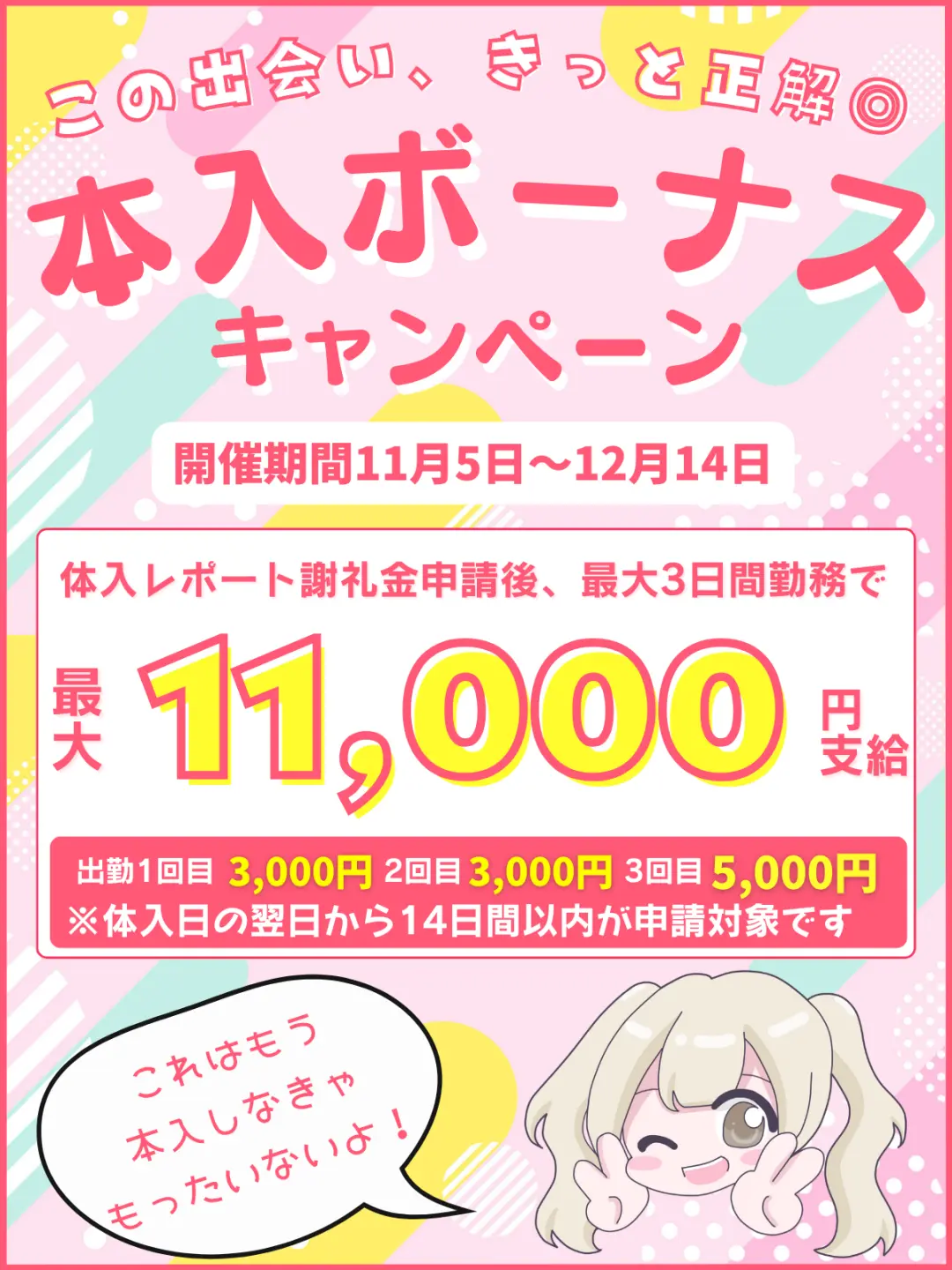※「体入日」の翌日から最大14日間がボーナス対象期間です。